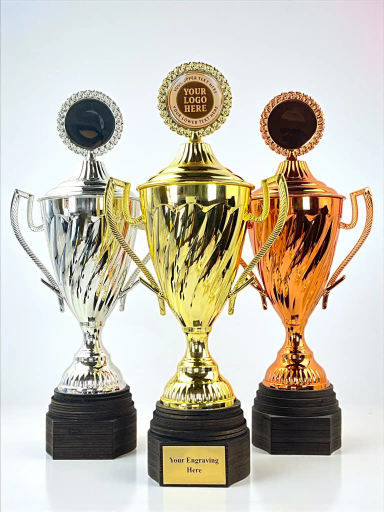 Trofeo de plástico asequible con un elegante acabado metálico y una sólida base de madera. Incluye grabado personalizado en la placa frontal y espacio para insertar tu logotipo en la parte superior. Disponible en oro, plata y bronce, es ideal para eventos deportivos, competiciones escolares y premios corporativos.