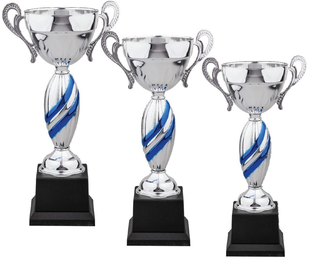 La Copa de Rayas Plateadas y Azules es un excelente trofeo que emocionará a sus ganadores. Consta de una base de PVC negro, con una columna de plástico plateado y un recipiente de metal. Presenta rayas azules en la columna. Disponible en 3 tamaños: 15", 13.5", 12".