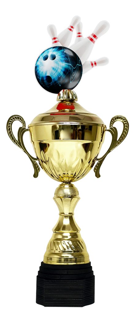 Está fabricada con una elegante copa de metal dorado, con asas y tapa. En la parte superior de la tapa, se coloca una figura de boliche de acrílico impresa en color. Estos elementos están montados sobre una auténtica base de madera de abedul. Elige entre 3 tamaños disponibles.