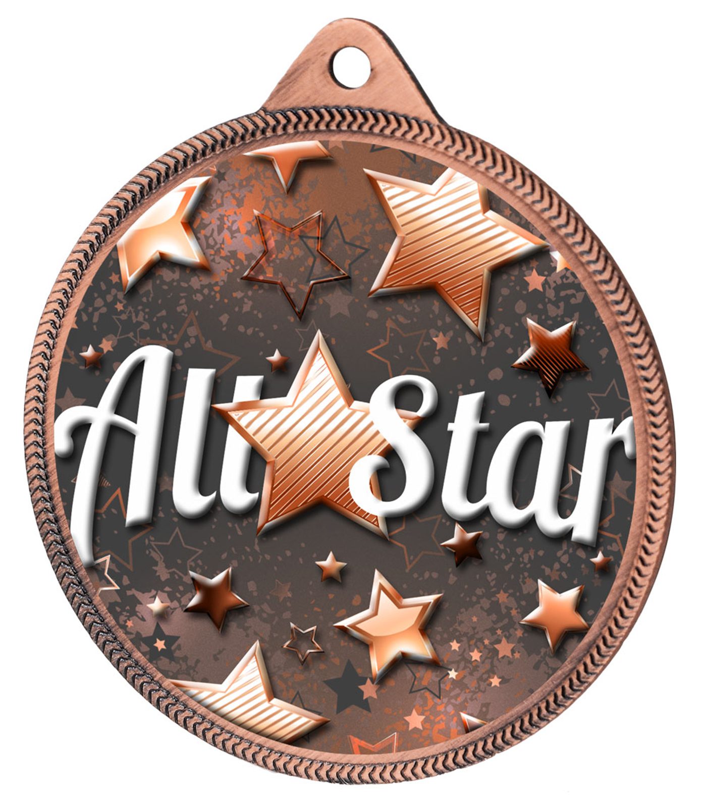 Una medalla All Star 5.4 cm verdaderamente excepcional fabricada en hierro. La medalla ha sido impresa utilizando la última tecnología de recubrimiento de textura 3D, haciendo que la medalla cobre vida con una impresión a color elevada y vibrante. ¡Dale un impulso a tu próxima presentación con estas modernas medallas que seguramente harán brillar los ojos de quien las reciba!