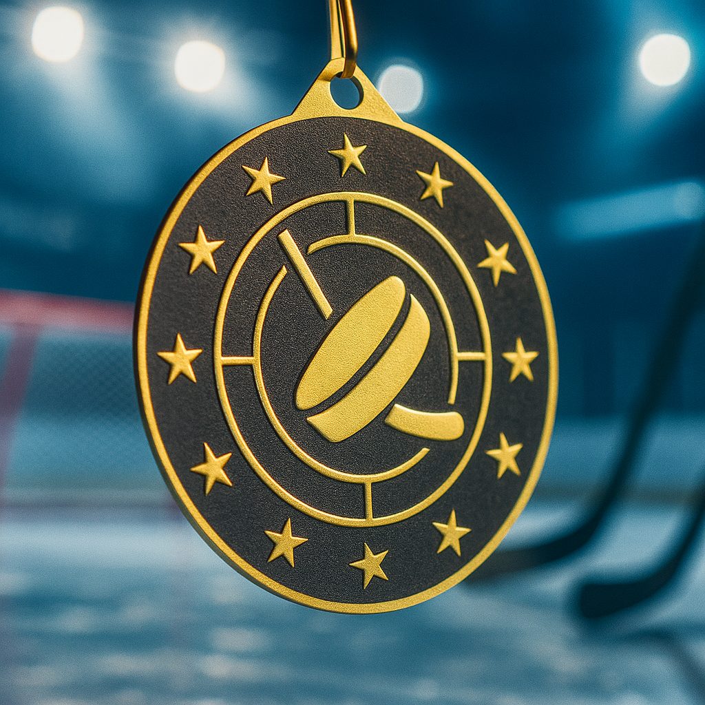 Acabado metálico premium: Fabricada con metal de alta calidad, con una superficie pulida y un diseño en relieve detallado que presenta un motivo deportivo central rodeado de estrellas.