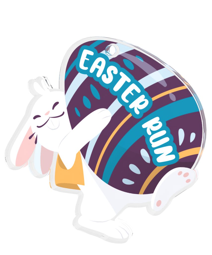 La Medalla de Campeón de Carrera de Pascua de Conejo está fabricada en acrílico de 3/32" de grosor con una impresión a color de alta calidad en reverso. Cortada expertamente en el centro, lo que le da un estilo único. Disponible en tres tamaños. La medalla incluye un bucle para colocar una cinta.