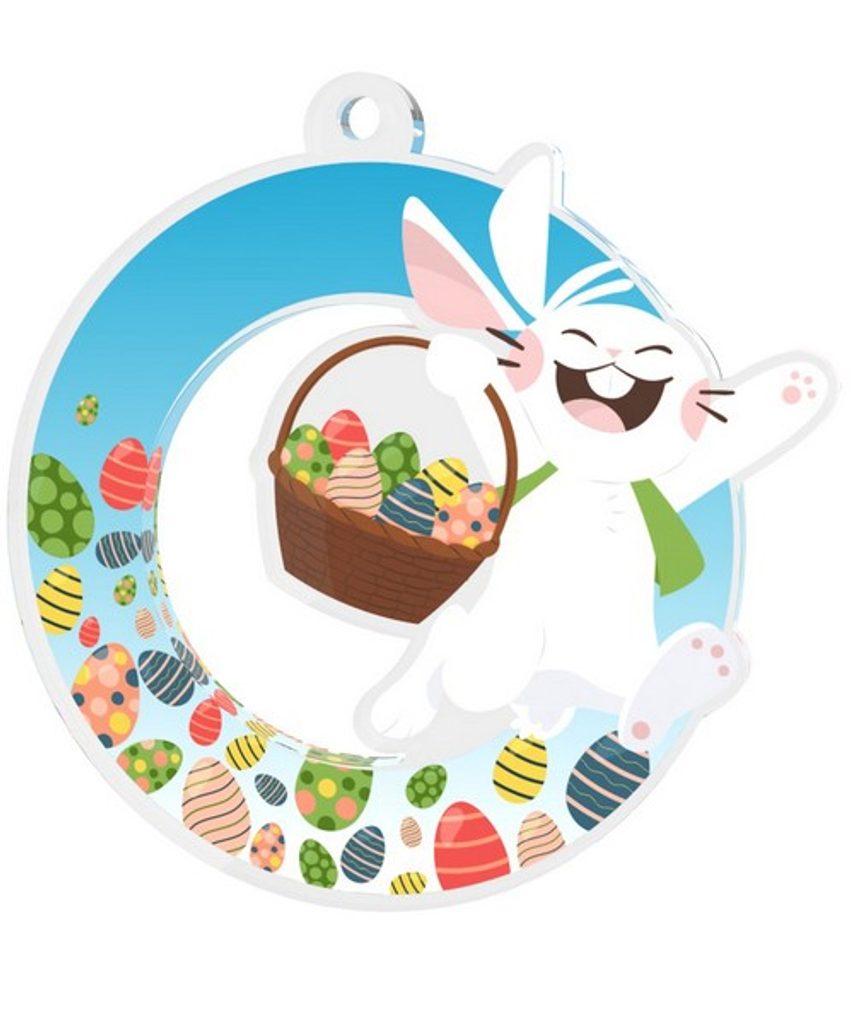 La Medalla de Canasta de Huevos del Conejo de Pascua está fabricada en acrílico de 3/32" de grosor con una impresión a color de muy alta calidad en reverso. Cortada expertamente en el centro, lo que le da un estilo único. Disponible en tres tamaños. La medalla incluye un bucle para colocar una cinta.