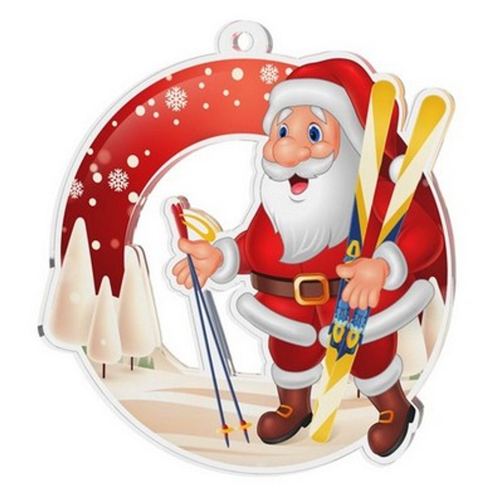 Haga que la temporada festiva sea especial con nuestra Medalla de Esquí de Papá Noel Nevado, fabricada en acrílico de 3 mm de grosor con una impresión a todo color de alta calidad en el reverso. Cortada expertamente para un estilo único. Elija entre tres tamaños. La medalla viene con un bucle para acomodar una cinta.