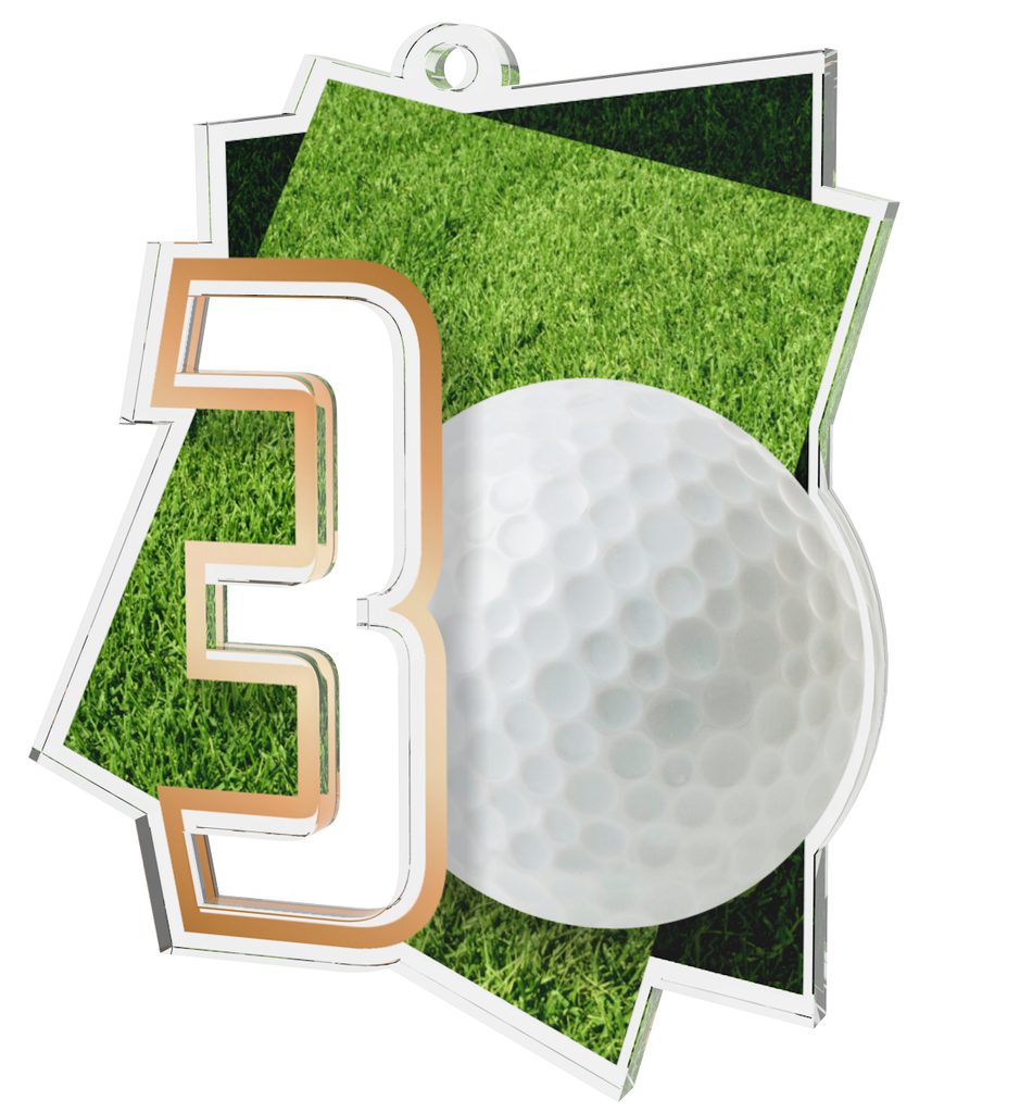 La Medalla de Golf Número 3, con un tamaño de 2 1/2", está fabricada en acrílico de 1/8" con una impresión a color de alta calidad en el reverso. El número está expertamente recortado, lo que le da un estilo único. Seleccione entre tres tamaños grandes. La medalla viene completa con un bucle para acomodar una cinta.