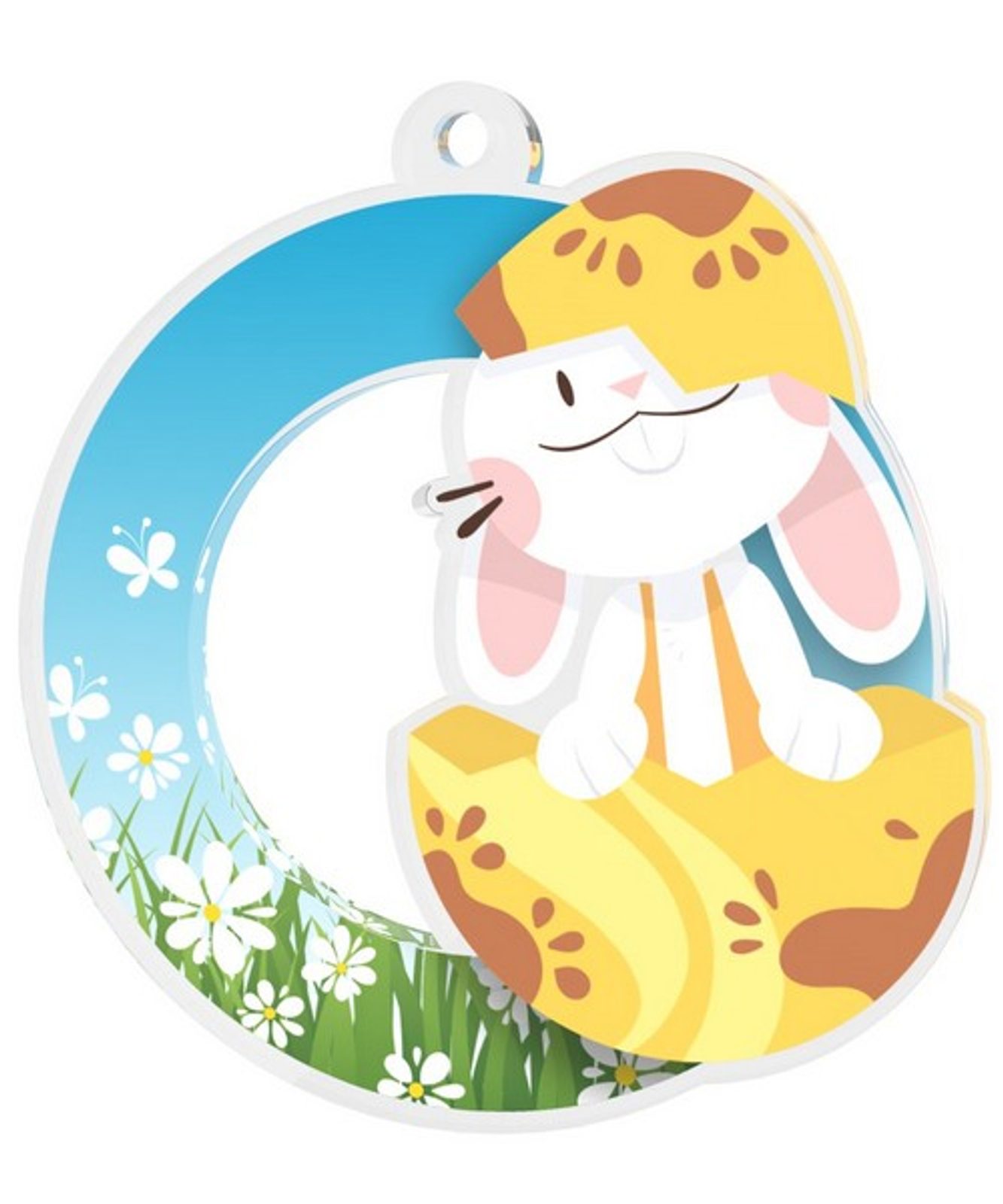 La Medalla de Huevo Agrietado del Conejo de Pascua está fabricada en acrílico de 3/32" de grosor con una impresión a todo color de muy alta calidad en reverso. Cortada expertamente en el centro, lo que le da un estilo único. Disponible en tres tamaños. La medalla incluye un bucle para colocar una cinta.