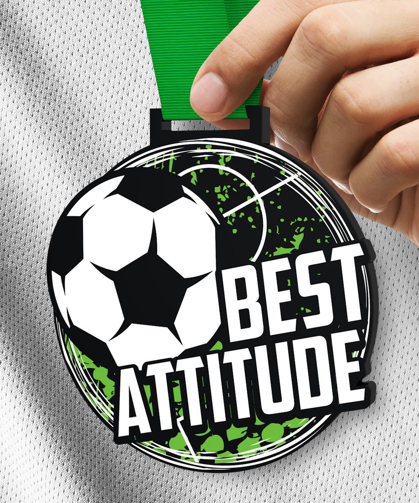 La Medalla Gigante de Mejor Actitud en Fútbol es una pieza impresionante con un diseño llamativo, fabricada exclusivamente por Trophy Monster. Elaborada en acrílico negro grueso de 5/16", esta medalla cuenta con una impresión a color de alta calidad que sin duda captará la atención.