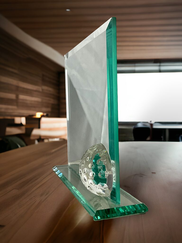 El Premio de Golf de Cristal Mirando es un trofeo de cristal de muy alta calidad, con un grosor de 1/4" y bordes biselados pesados. Presenta una pelota de golf de cristal 3D montada sobre una base de vidrio sólido.