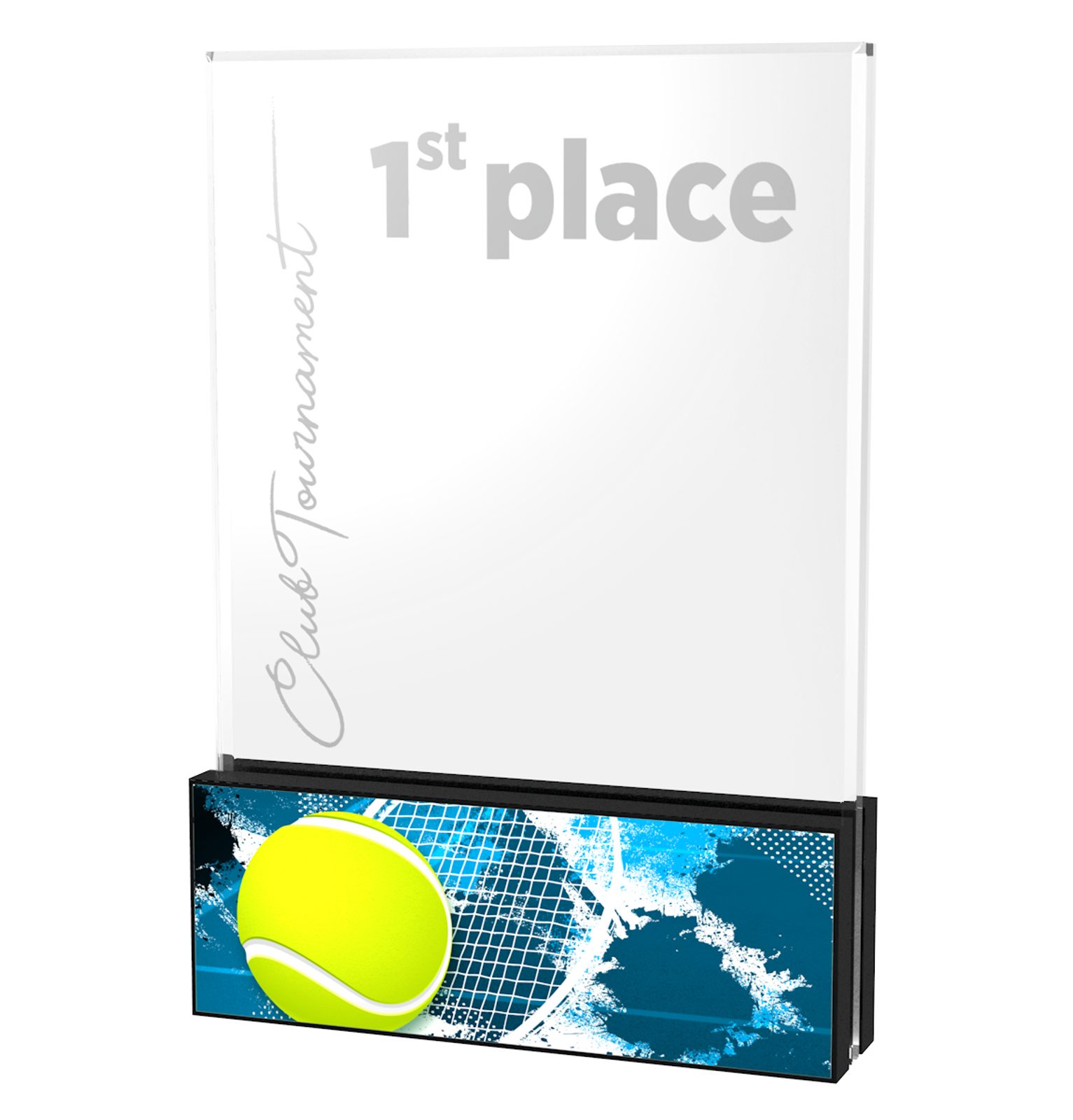 El Premio de Tenis de Acrílico con Diseño de Ciudad es un innovador trofeo creado en casa. Este galardón está fabricado con acrílico premium de 0.4" de grosor, montado entre dos piezas de acrílico negro de 0.4" de grosor con forma especial. Esto proporciona al trofeo una base profesional y resistente.