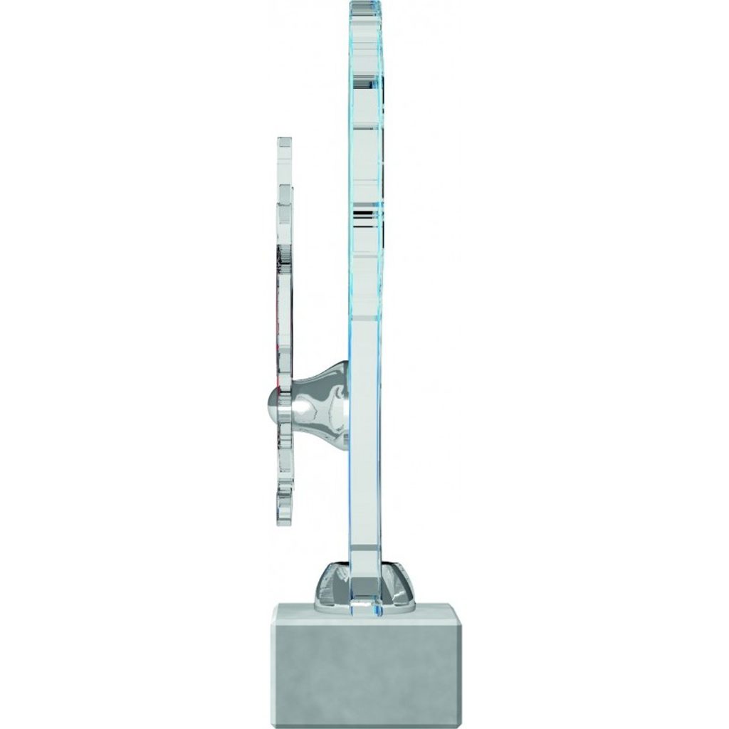 El Premio de Acrílico Personalizado Farnsworth es el campeón en diseño de trofeos. La pieza central de acrílico se corta en forma y se fija por ambos lados con un soporte dorado o plateado. Luego, fijamos una segunda pieza de acrílico cortada en forma, que se atornilla en el frente. Esto se monta sobre una base de mármol negro de gran peso.