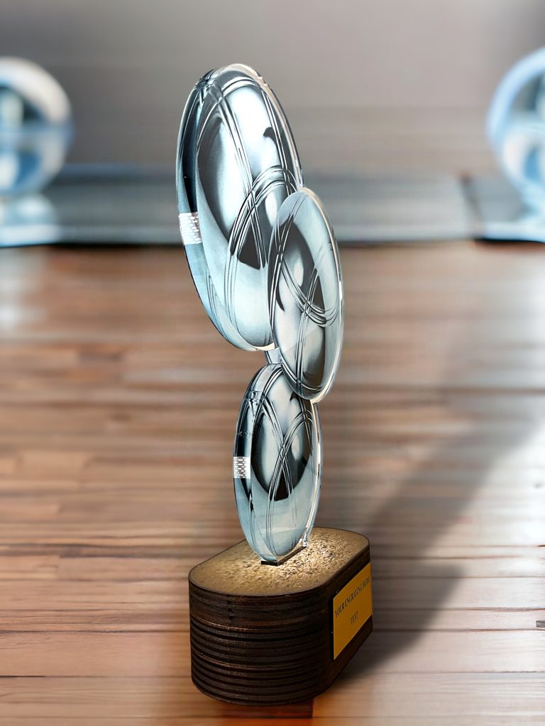 Presentamos el premio trofeo moderno e innovador que garantiza impresionar. Con un concepto completamente único, este trofeo está fabricado con una combinación de acrílico impreso biselado, montado elegantemente sobre una base inclinada especialmente diseñada de madera de abedul sustentable, con un acabado impreso que realza su atractivo estético.