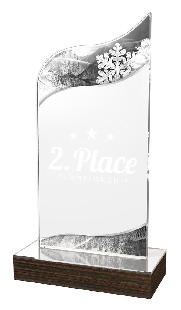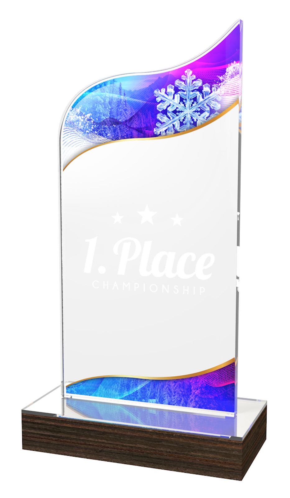 Un impresionante trofeo de diseño propio que combina acrílico con madera real. El trofeo está fabricado con acrílico premium de 8 mm de grosor montado sobre una base de madera de abedul de 4 capas. Se completa con una parte superior de espejo acrílico, creando un galardón único y expertamente terminado.