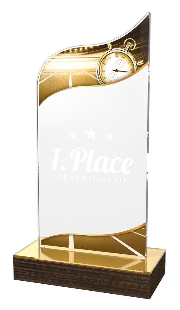 El diseño de impresión se aplica en ambos lados, superior e inferior del trofeo. Ofrecemos IMPRESIÓN GRATUITA con el texto de su elección en la sección central transparente. Nuestro estudio organizará el diseño de su texto para que se ajuste perfectamente al área de impresión. Elija entre un acabado clásico dorado, plateado o bronce.