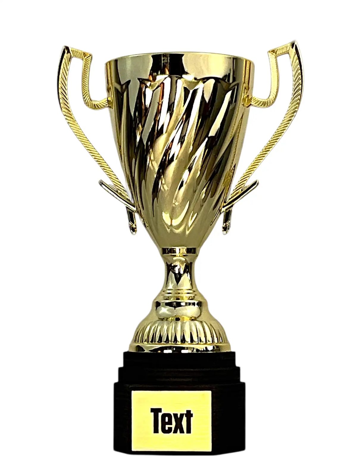 Copa de plástico dorada de alta calidad, montada sobre una base redonda de madera de abedul, con un panel frontal plano para incluir una placa grabada gratuita. Disponible en cuatro tamaños y a un precio asequible, adecuada para todos los presupuestos.
