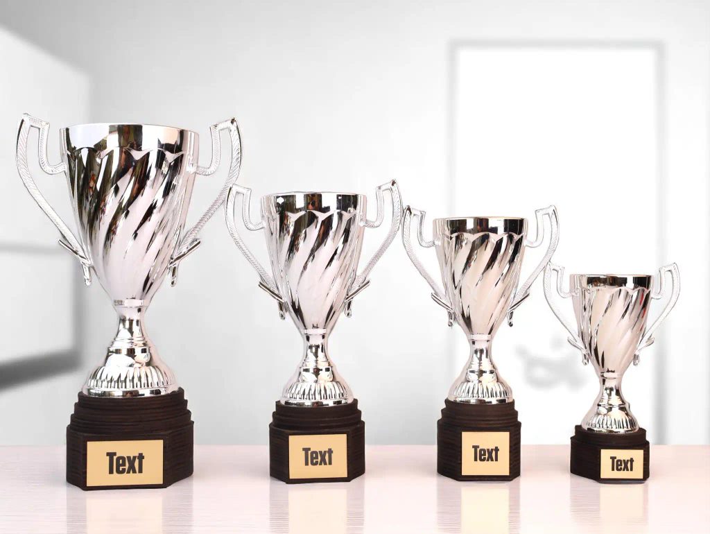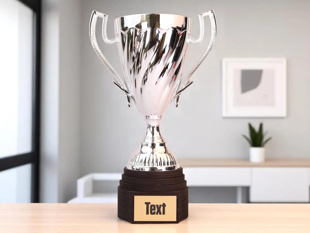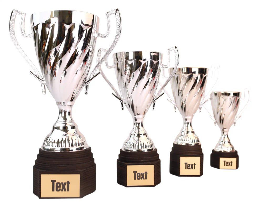 Copa de plástico plateada de alta calidad, montada sobre una base redonda de madera de abedul, con un panel frontal plano para incluir una placa grabada gratuita. Disponible en cuatro tamaños y a un precio asequible, ideal para ajustarse a todos los presupuestos.