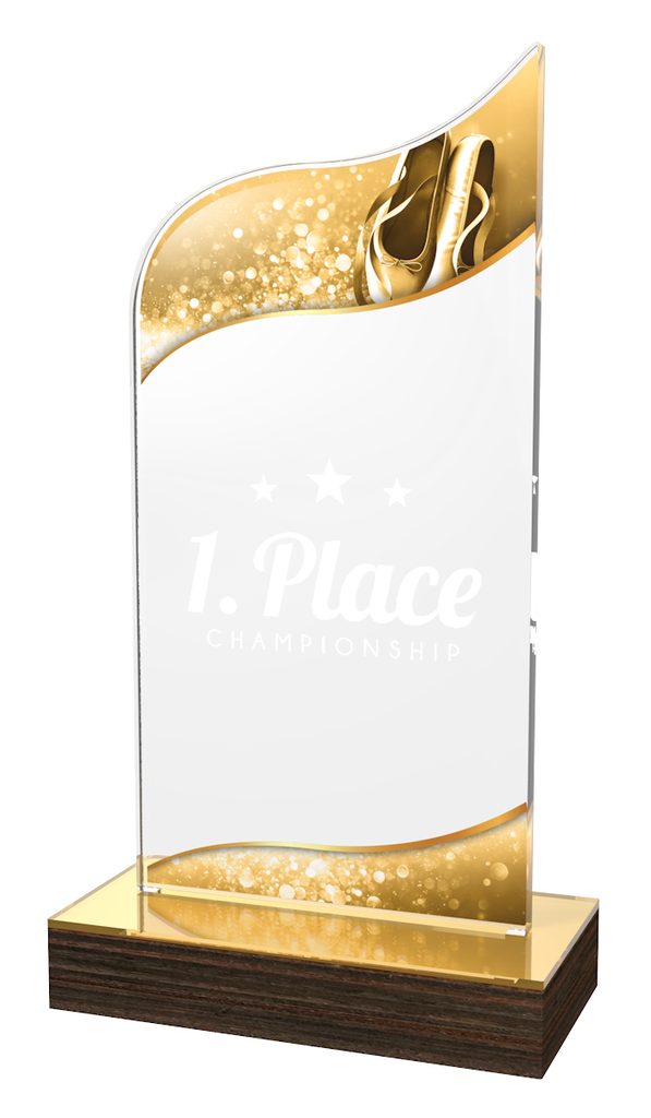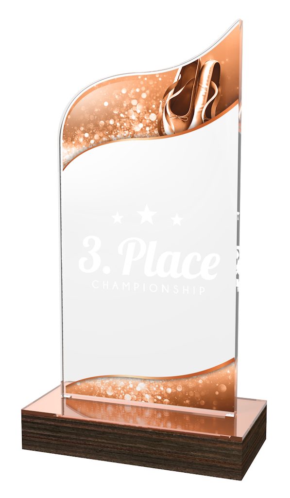 Un impresionante trofeo de diseño propio que combina acrílico con madera real. El trofeo está fabricado con acrílico premium de 5/16" de grosor montado sobre una base de madera de abedul de 4 capas. Se completa con una parte superior de espejo acrílico, creando un galardón único y expertamente terminado.