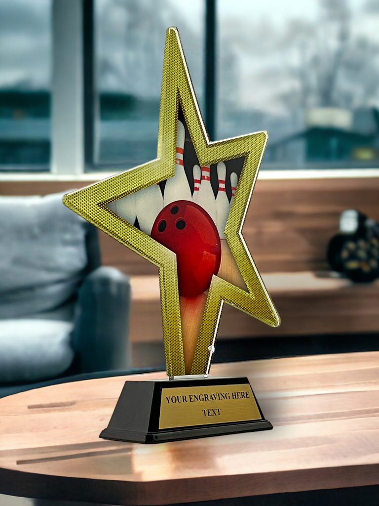 El Trofeo de Boliche Estrella de Oro es una interpretación moderna de un galardón clásico. Cortado con una forma especial, este trofeo cobra vida con una impresión a todo color de alta calidad en el reverso del acrílico de 4mm, montado sobre una base de PVC negro.