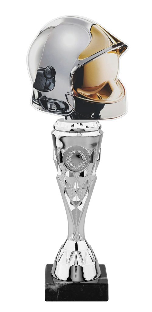 El Trofeo de Casco de Bombero de Plata con Parte Superior de Acrílico representa lo último en diseño contemporáneo. Observe cómo los ojos se iluminan al presentar este galardón, con una impresión a todo color de alta calidad en el reverso de un acrílico de 4 mm de grosor, montado sobre una elegante columna de plástico plateado, que a su vez está montada sobre una base de mármol negro.