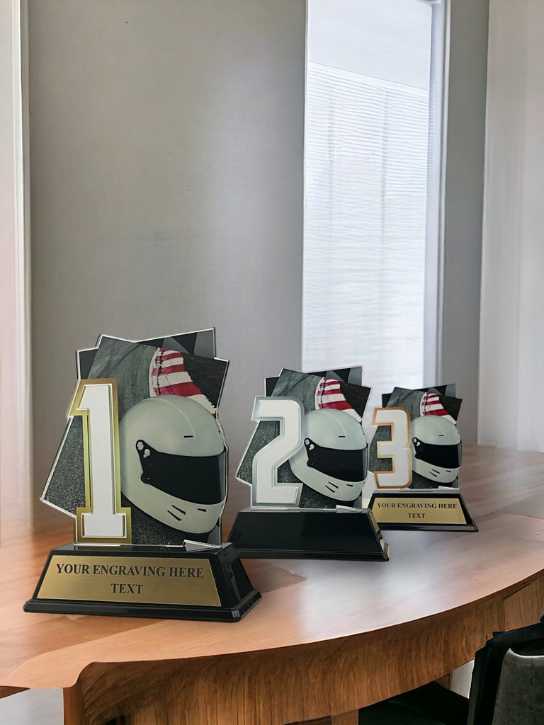 El Trofeo de Casco de Motorsports Número 1 es una interpretación moderna de un estilo clásico de premio para el primer lugar. Cortado con forma, este trofeo presenta una impresión a todo color de alta calidad en el reverso del acrílico de 4 mm montado sobre una base de PVC negro. Tamaño del trofeo 5 1/2".