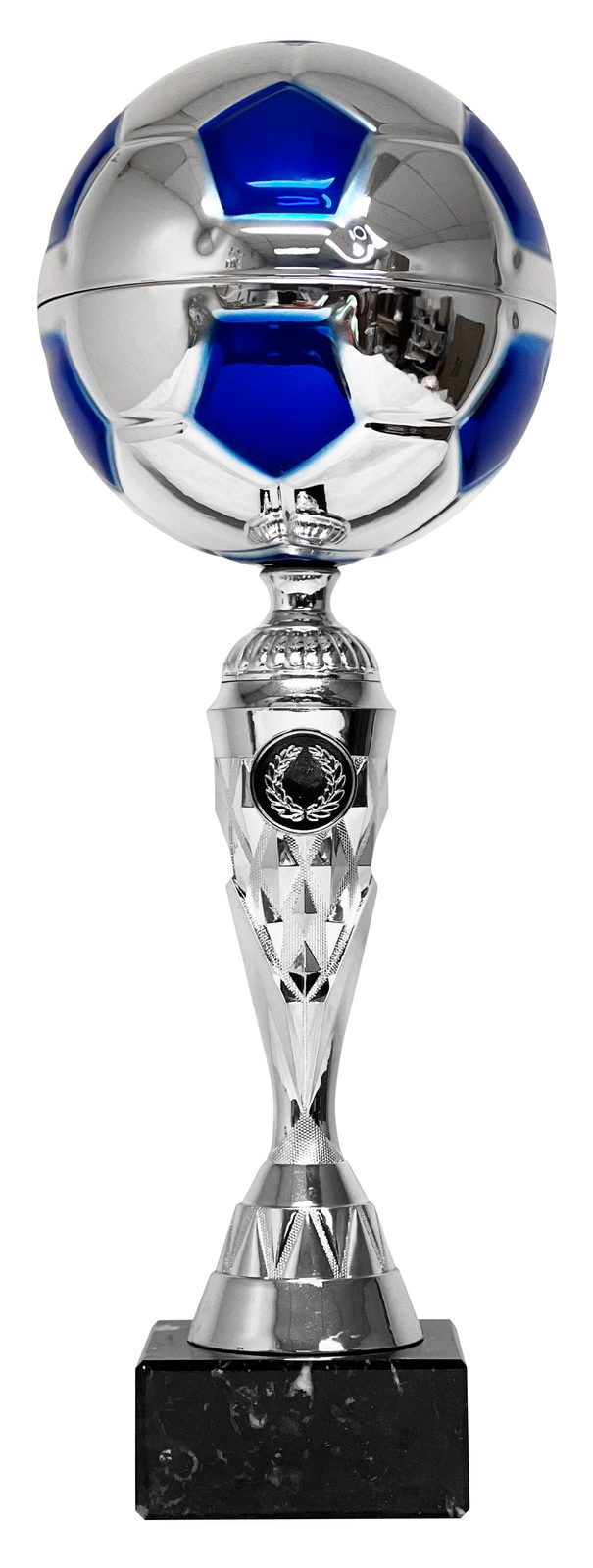 ¡Exclusivo de Trophy Monster, el Trofeo de Fútbol Merida Plateado y Azul TL2095 es un premio premium a precio accesible. Consiste en un balón de fútbol de metal de calidad que está fijado a un tallo de plástico de alta definición. Montado sobre una base de mármol pesada, ¡produce un premio destacado para su próxima presentación!