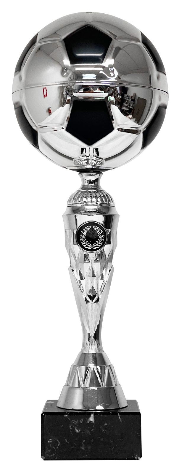 Exclusivo de Trophy Monster, el Trofeo de Fútbol Merida Plateado y Negro TL2096 es un premio premium a precio accesible. Consiste en un balón de fútbol de metal de calidad que está fijado a un vástago de plástico de alta definición. Montado sobre una base de mármol pesada, ¡produce un premio destacado para su próxima presentación!