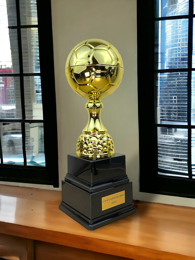 El balón llamativo en la parte superior está elaborado con metal de alta calidad y fijado de manera segura a un robusto soporte de plástico. Estos elementos están elegantemente unidos a una base de PVC de doble nivel, creando un trofeo verdaderamente único e impactante.