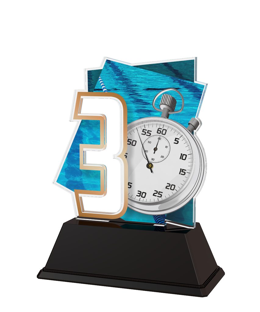 El Trofeo de Natación Número 3 es una interpretación moderna de un estilo clásico de reconocimiento para el tercer lugar. Cortado con forma especial, este trofeo presenta una impresión a todo color de alta calidad en el reverso del acrílico de 1/8" de grosor, montado sobre una base de PVC negro.