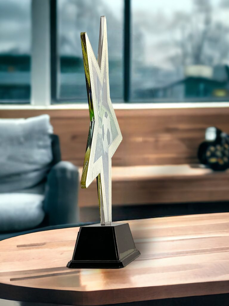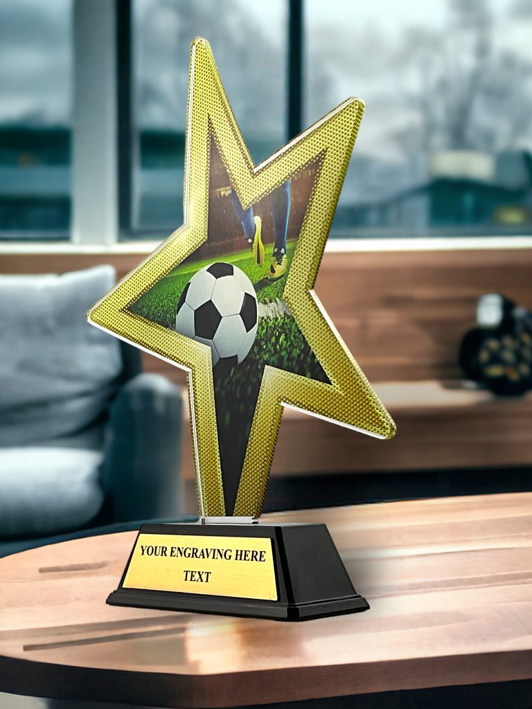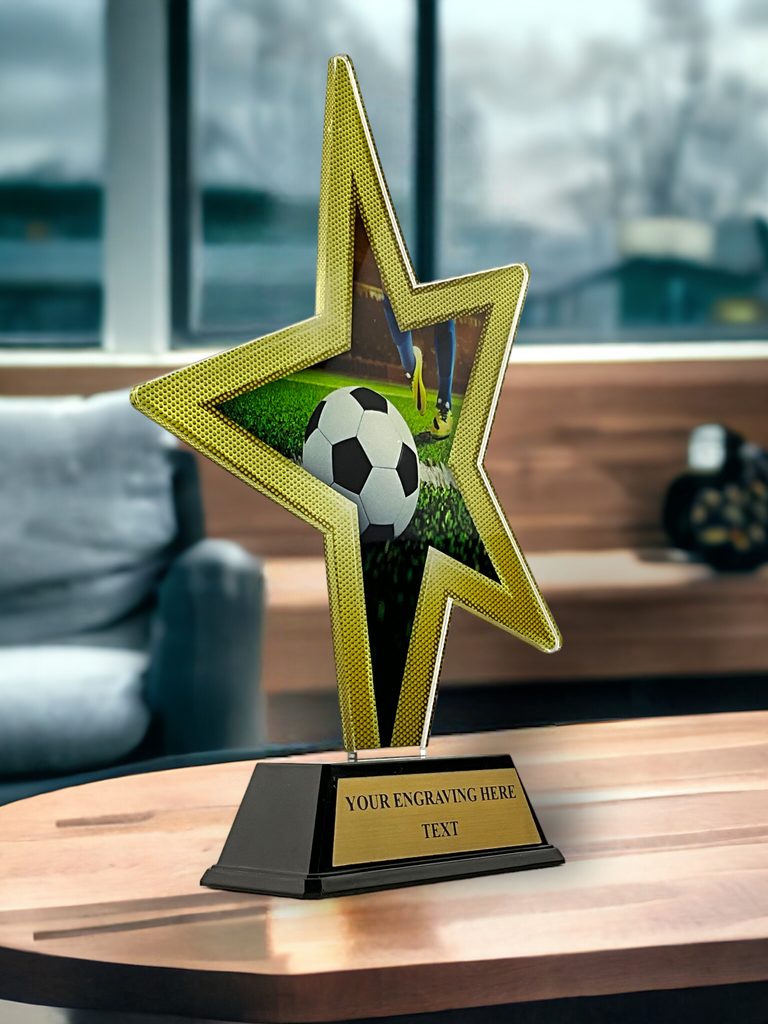 El Trofeo Estrella de Oro de Fútbol es una interpretación moderna de un galardón clásico. Cortado con una forma especial, este trofeo cobra vida con una impresión a todo color de alta calidad en el reverso del acrílico de 4mm, montado sobre una base de PVC negro.