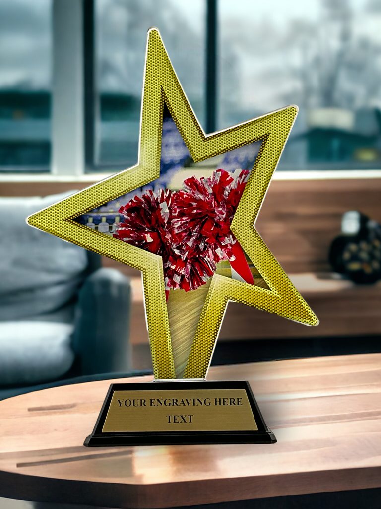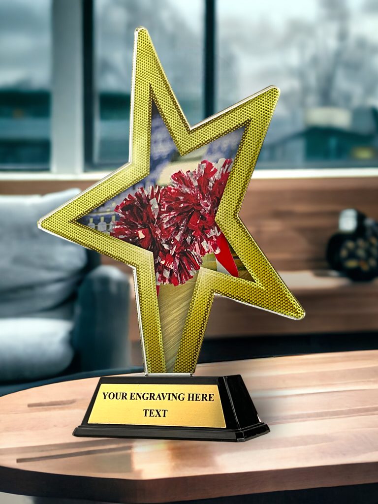 El Trofeo de Estrella de Oro para Animadoras es una interpretación moderna de un galardón clásico. Cortado con una forma especial, este trofeo cobra vida con una impresión a todo color de alta calidad en el reverso de un acrílico de 4mm montado sobre una base de PVC negro.