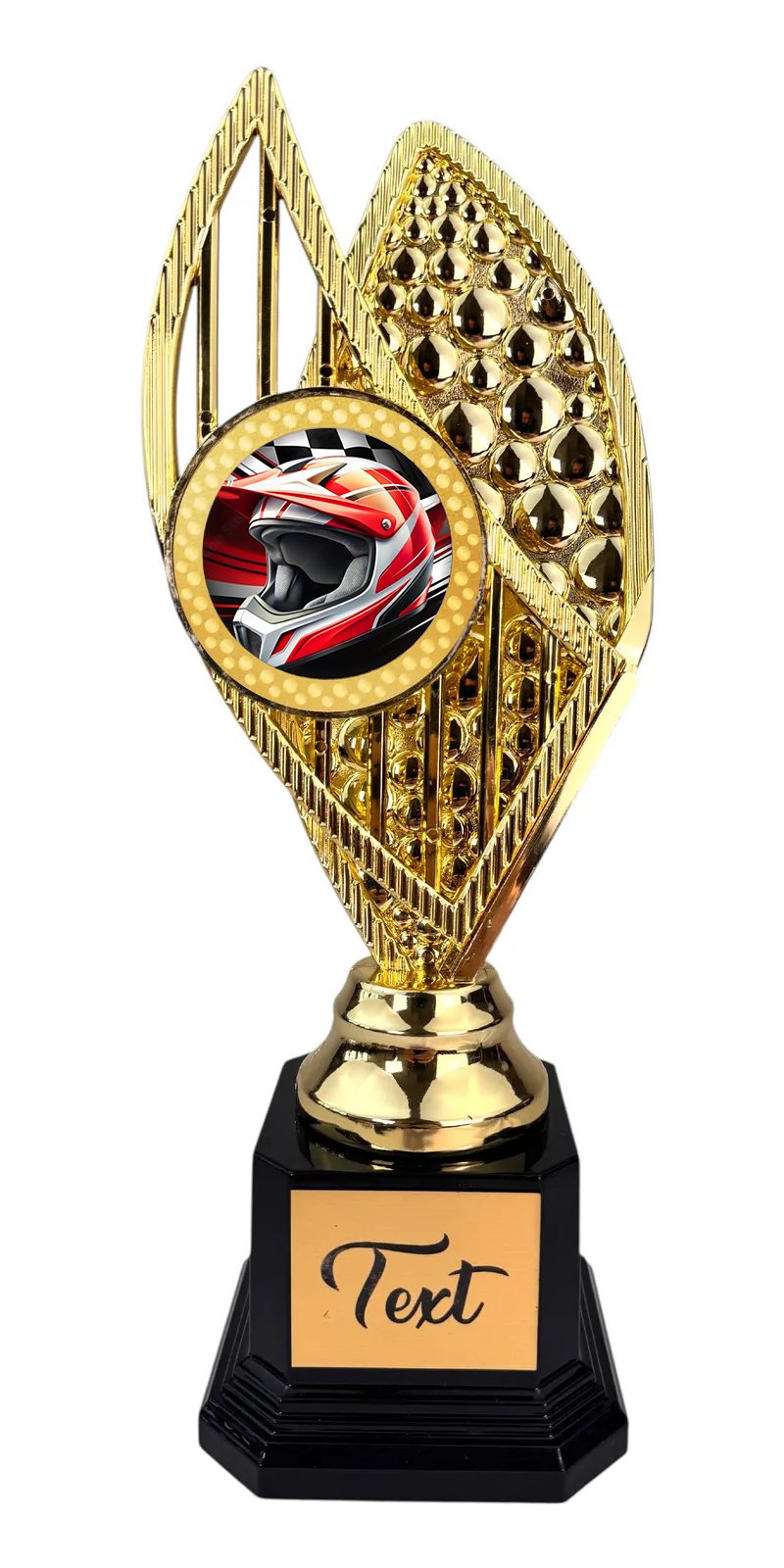 Presenta un reconocimiento elegante y accesible con nuestro trofeo de plástico premium, disponible en acabados oro, plata y bronce. Este diseño llamativo cuenta con un remate moderno y texturizado, con un área central para insertar tu deporte o logotipo personalizado.