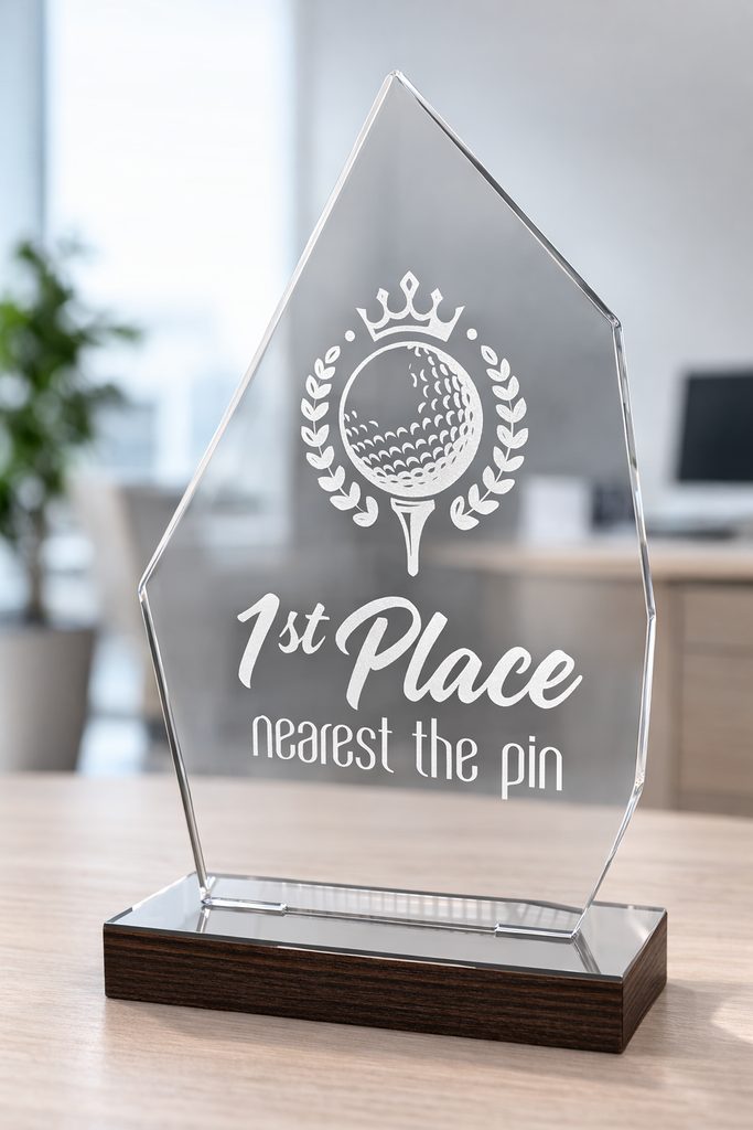 Un diseño interno que combina acrílico con madera real. El trofeo está fabricado con acrílico premium de 5/16" de grosor montado sobre una base de madera de abedul de 4 capas. Esto se completa con una parte superior de acrílico que se ajusta a la base, creando un premio único y expertamente terminado.