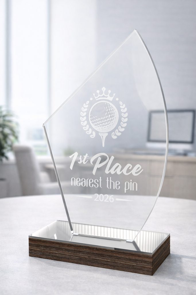 Un diseño interno que combina acrílico con madera real. El trofeo está fabricado con acrílico premium de 5/16" de grosor montado sobre una base de madera de abedul de 4 capas. Esto se completa con una parte superior de acrílico que se ajusta a la base, creando un premio único y expertamente terminado.