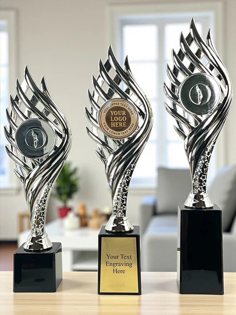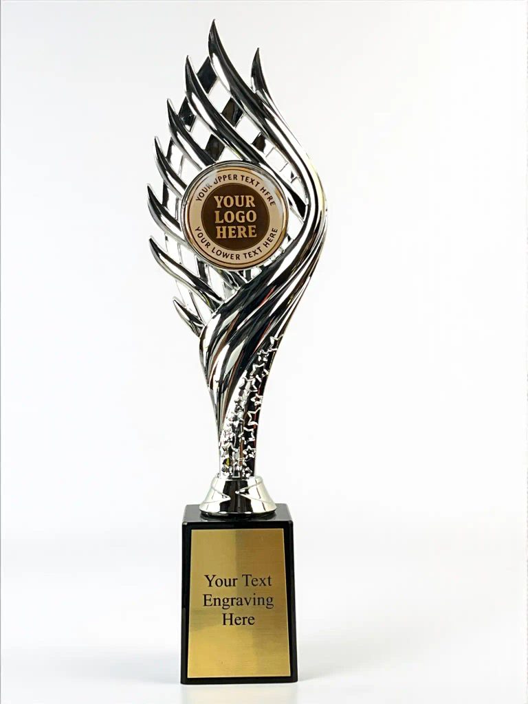 El Trofeo Vinton Silver es un premio de gran tamaño a un precio muy asequible. Está fabricado en plástico con un acabado exterior plateado y un recubrimiento interior de color azul. Está montado sobre una base de plástico negro.
