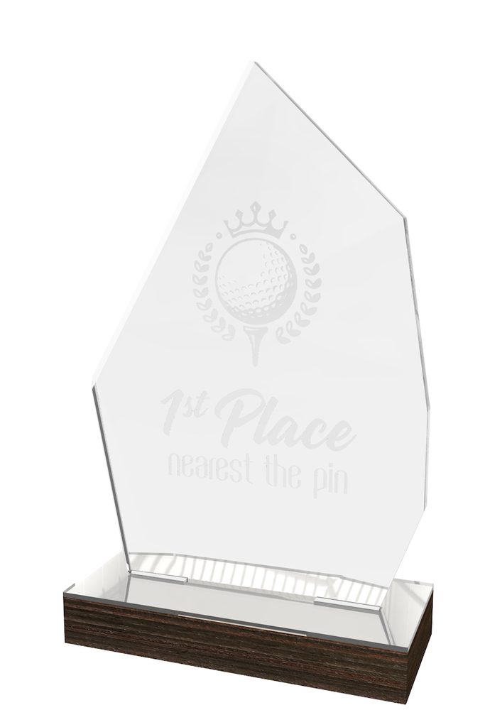 Un diseño interno que combina acrílico con madera real. El trofeo está fabricado con acrílico premium de 5/16" de grosor montado sobre una base de madera de abedul de 4 capas. Esto se completa con una parte superior de acrílico que se ajusta a la base, creando un premio único y expertamente terminado.