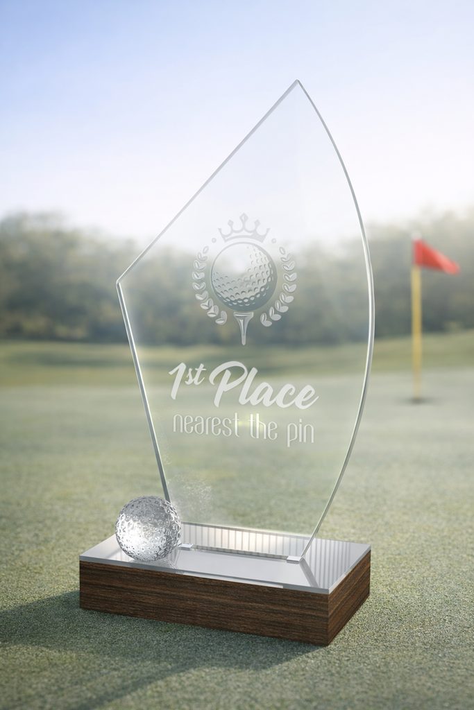 Presentamos nuestro impresionante diseño propio que combina perfectamente acrílico premium con madera real para crear el Trofeo de Golf. Elaborado meticulosamente con precisión, este galardón cuenta con una parte superior de acrílico de 5/16" de grosor montada sobre una base de abedul de 4 capas, completada con una pelota de golf de cristal. La parte superior de acrílico está expertamente ajustada a la base, lo que resulta en un acabado único y pulido que seguramente dejará una impresión duradera.