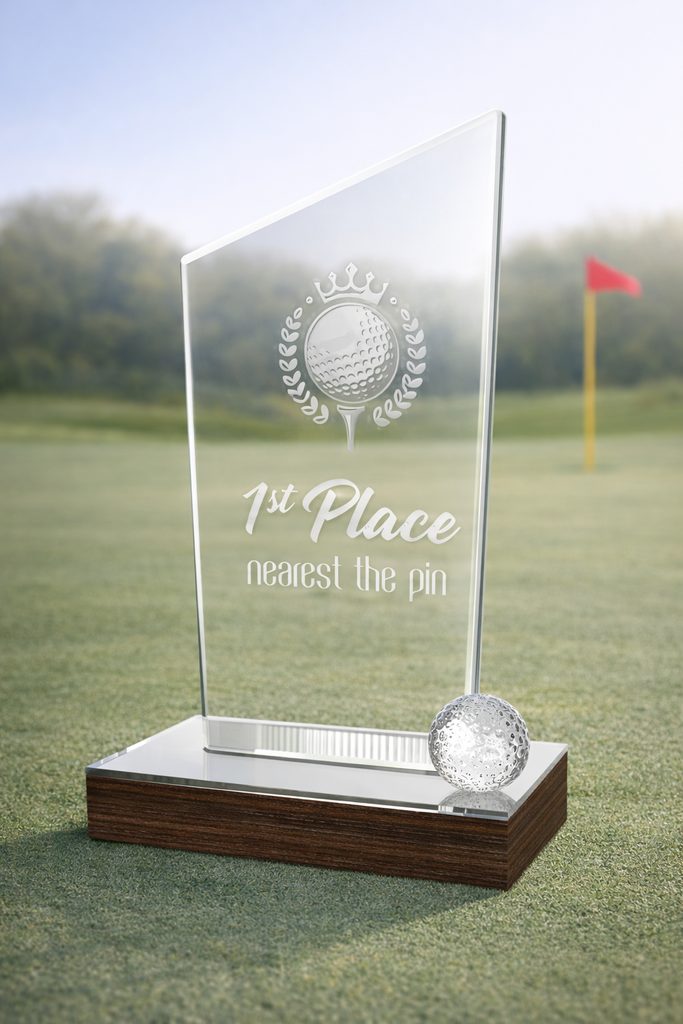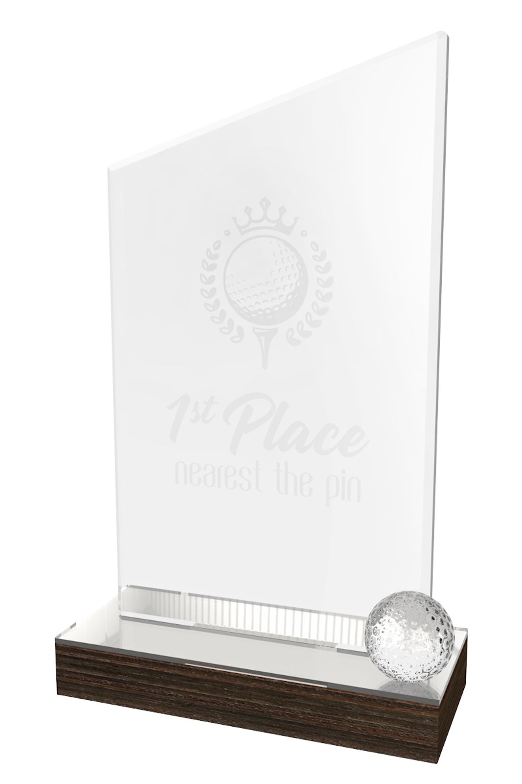 Presentamos nuestro impresionante diseño propio que combina perfectamente acrílico premium con madera real para crear el Trofeo de Golf. Elaborado meticulosamente con precisión, este premio cuenta con una parte superior de acrílico de 5/16" de grosor montada sobre una base de abedul de 4 capas, completada con una pelota de golf de cristal. La parte superior de acrílico está expertamente ajustada a la base, lo que resulta en un acabado único y pulido que seguramente dejará una impresión duradera.